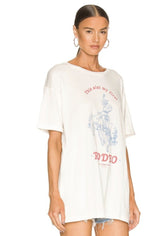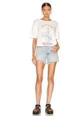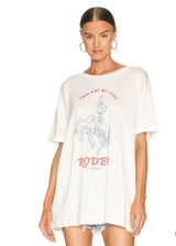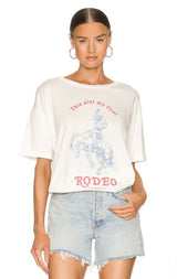 A playful and nostalgic graphic print showcasing "First Rodeo" as part of a collection inspired by Americana. The fabric feels luxuriously soft and smooth against the skin, offering a breathable, lightweight comfort due to its unique blend of 50% cotton and 50% modal butter jersey knit.