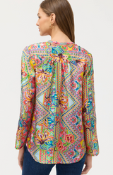 Crafted from 100% rich silk, the Heaven Button Up is adorned with vibrant color in a kaleidoscope of pattern. Designed with a classic button-front with gathers at the neckline, this V-front top is finished with a curved hemline and roll-tab sleeves. Pair with dark wash denim and casual loafers for a weekend lunch date with friends.