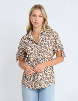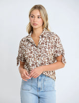 Drop sleeve collared shirt with concealed button front placket, chest patch pocket and tie sleeve details.
