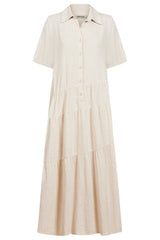 A feminine take on the shirt dress silhouette. Crafted from soft crinkle textured fabric. Features classic collar, full button-through front, tiered skirt, flared sleeves, and a subtle high-low hem. Lined for ease.