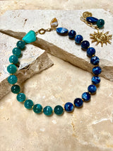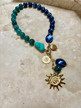 The Eleni Necklace is your new go-to for turning heads. Strung with gorgeous turquoise beads and accented with gleaming gold, this stunner features a removable sun pendant that gives you serious styling flexibility. Wear it as a delicate beaded necklace for everyday charm, or snap on the pendant for a bold, eye-catching look. Two necklaces in one—because why settle for just one vibe when you can have them all?
