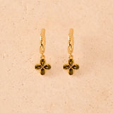 A four-leaf clover pendant on small hoop earrings, hand-set in gold with a textured and irregular finish. Each leaf is formed by a deep green, pear-cut stone.