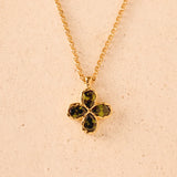 A four-leaf clover pendant necklace hand-set in gold, with a textured and irregular finish. Each leaf is formed by a deep green, pear-cut stone.