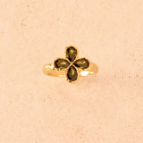 A four-leaf clover ring hand-set in gold, with a textured band and an irregular finish. Each leaf is formed by a deep green, pear-cut stone.