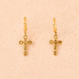 A small cross-shaped pendant suspended from a mini hoop, with oval green stones carefully handset in gold. A luminous and enduring emblem.