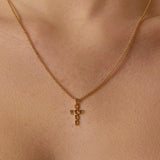 A small cross-shaped pendant on a thin chain, with oval green stones carefully handset in gold. A luminous and enduring emblem.