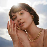 The Thalla floral drop earrings feature two delicately hammered five-petal flower pendants with meticulous details.